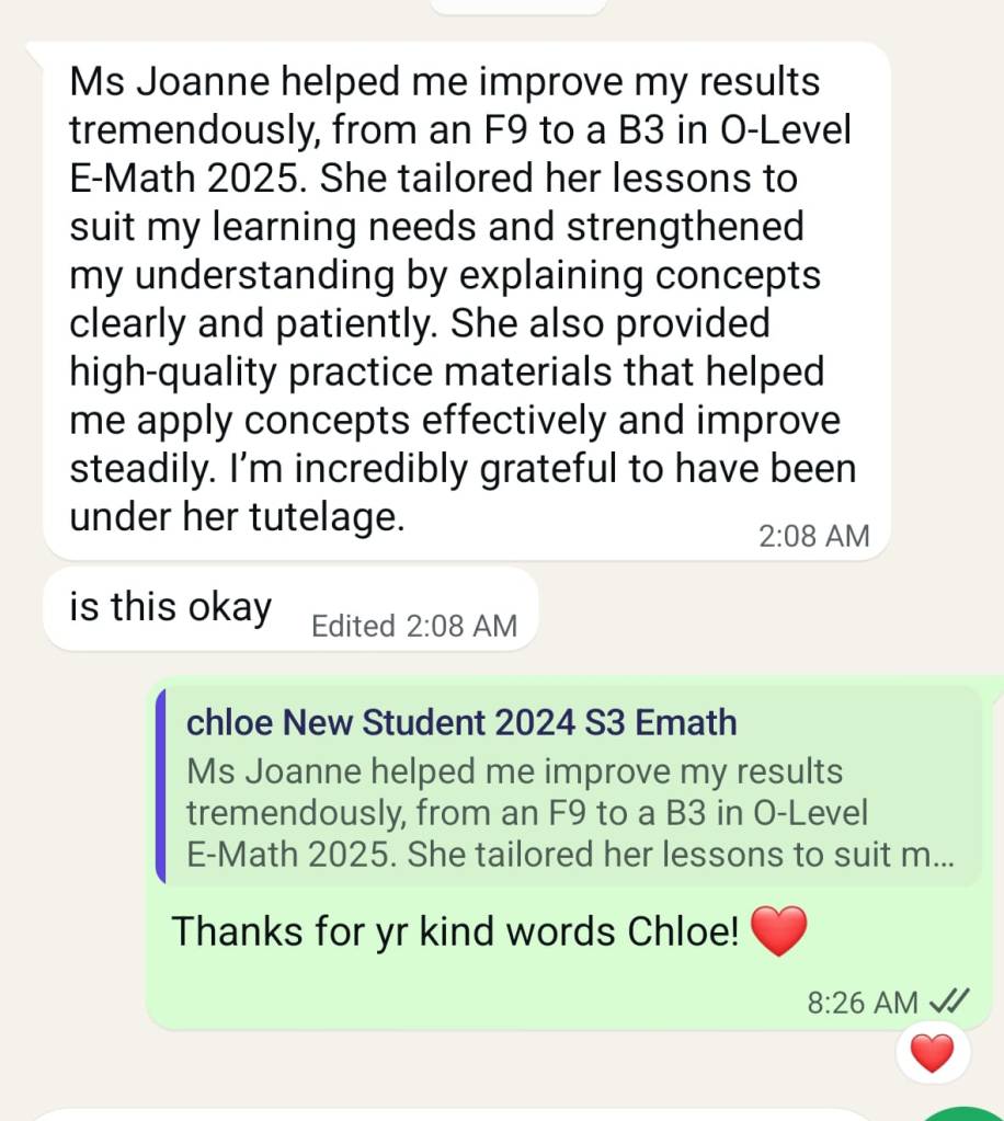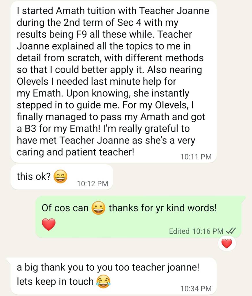 Improvement from F9 to B3 for Emath in O levels